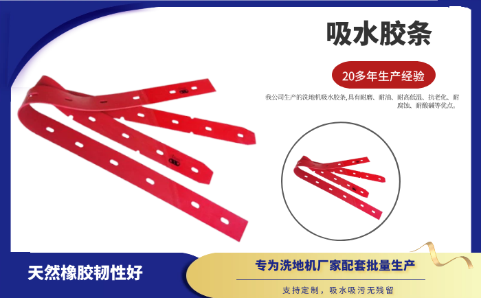 產品說明:吸水膠條是洗地機吸水扒上的重要部件,作用就是與地面接觸,產生一個密封的空間,把地面上的污水通過風機進行回收。吸水膠條一般分為耐油型(進口PU原料)和普通型(進口NR原料)兩種。